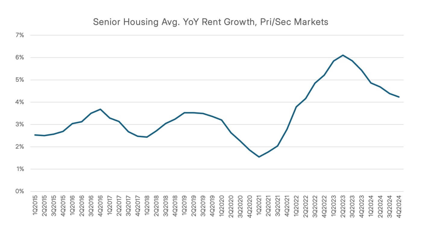 After years of volatility due to the pandemic and rising inflation, we’re finally seeing annual rate increases begin to stabilize. In 2024, Majority Independent Living properties experienced 4% year-over-year rent growth, while Majority Assisted Living properties trended toward 4.3%. These figures represent a consistent and predictable stabilization of annual rent increases compared to the zig-zag over the past few years from a deceleration during the pandemic and a rapid rebound driven by inflation.