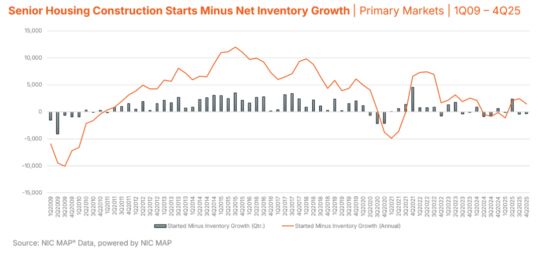 Senior housing construction trends are telling a very clear story. Development activity across the sector has slowed materially, with new inventory growth, active construction volume, and construction starts all trending down.