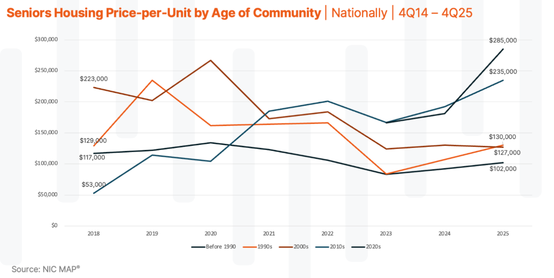 Age of property offers a useful proxy for asset quality and classification. When viewed through this lens, the bifurcation becomes clear. The increase in industry-wide PPU is largely attributable to newer properties opened within the last 15 years, with communities delivered since 2020 posting the most pronounced gains. These assets are benefiting from modern design, competitive operating profiles, and alignment with current consumer expectations. Capital is not just paying more—it is choosing more carefully.