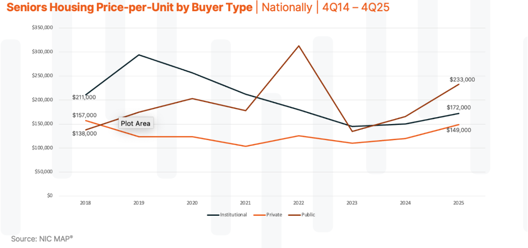 Buyer behavior has also played a central role in shaping recent transaction trends. A clear split has emerged between public and private buyers, with large public healthcare REITs—including Welltower and Ventas—helping drive higher PPUs across the market.