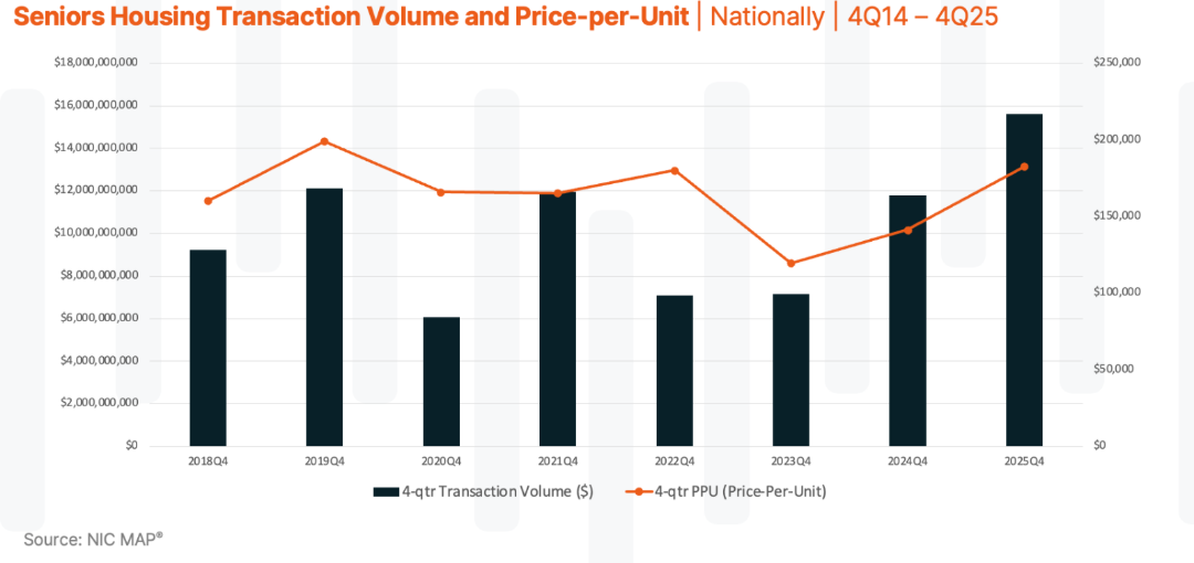 Nationally, senior housing transaction investment volume has expanded for the second consecutive year, reaching more than $15.6 billion in 2025 on a rolling four-quarter basis, the highest level recorded in the past eight years. This sustained increase reflects a meaningful expansion in capital allocation to the sector, driven by improved pricing clarity and greater conviction around long-term fundamentals.
