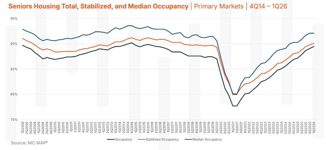 NIC MAP’s 1Q26 data brings that into focus. Median occupancy in primary markets has moved just above 92%, with stabilized occupancy slightly over 90%. That may not sound dramatic on its own, but it starts to mean something different when you consider how senior housing actually operates day-to-day. This is where interpretation matters. The industry may be closer to full capacity than it realizes—an important signal in today’s operating environment.